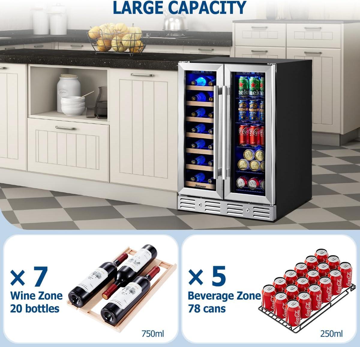 LARGE CAPACITY FOR WINE & CANS: This mini fridge holds up to 120 cans of your favorite drinks or wines in different sizes. Soft white LED lights help you select your favorite drink at all times. This beverage refrigerator could hold the wine you like too. You would not just enjoy your drink, could enjoy your wine too.